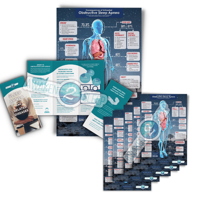 In addition to the brochures, our bundle includes two different-sized posters that can be displayed in your practice to raise awareness about the dangers of untreated sleep apnea. The posters feature eye-catching graphics and clear, concise messaging that will capture the attention of your patients and encourage them to learn more about this condition.